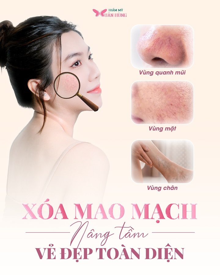 Xóa mao mạch tại Trung tâm thẩm mỹ Xuân Hùng – công nghệ hiện đại giúp giảm đỏ, làm mờ tia mạch nông và cải thiện thẩm mỹ trên mặt – mũi – chân. Hiệu quả nhanh, an toàn, không xâm lấn.